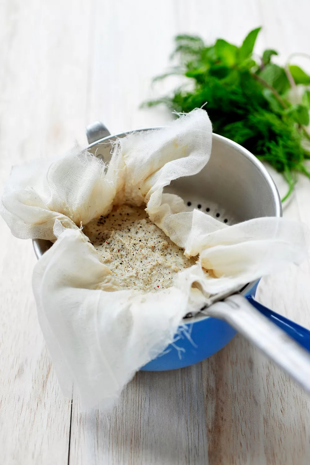 Neem een kom en hang er een zeef of vergiet in. Hang een kaasdoek oftewel een neteldoek in de zeef en stort hierin de cashewcrème.