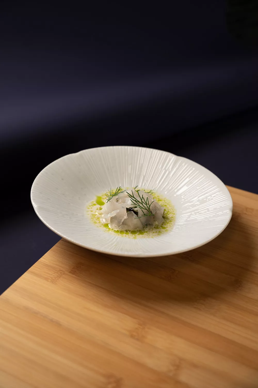 Een frisse ceviche van pladijs met subtiele hooirook, ingelegde zeewier en knapperige koolrabi, ideaal als zomers voorgerecht of verfijnd amusegerecht. Limoen en gember zorgen voor een pittig friszuur accent, terwijl sojasaus en korianderolie voor diepte en aroma zorgen. Fijn gesneden plakjes vis, korte rooksessie en een licht gebonden bouillon maken dit een moderne, smaakvolle visbereiding.