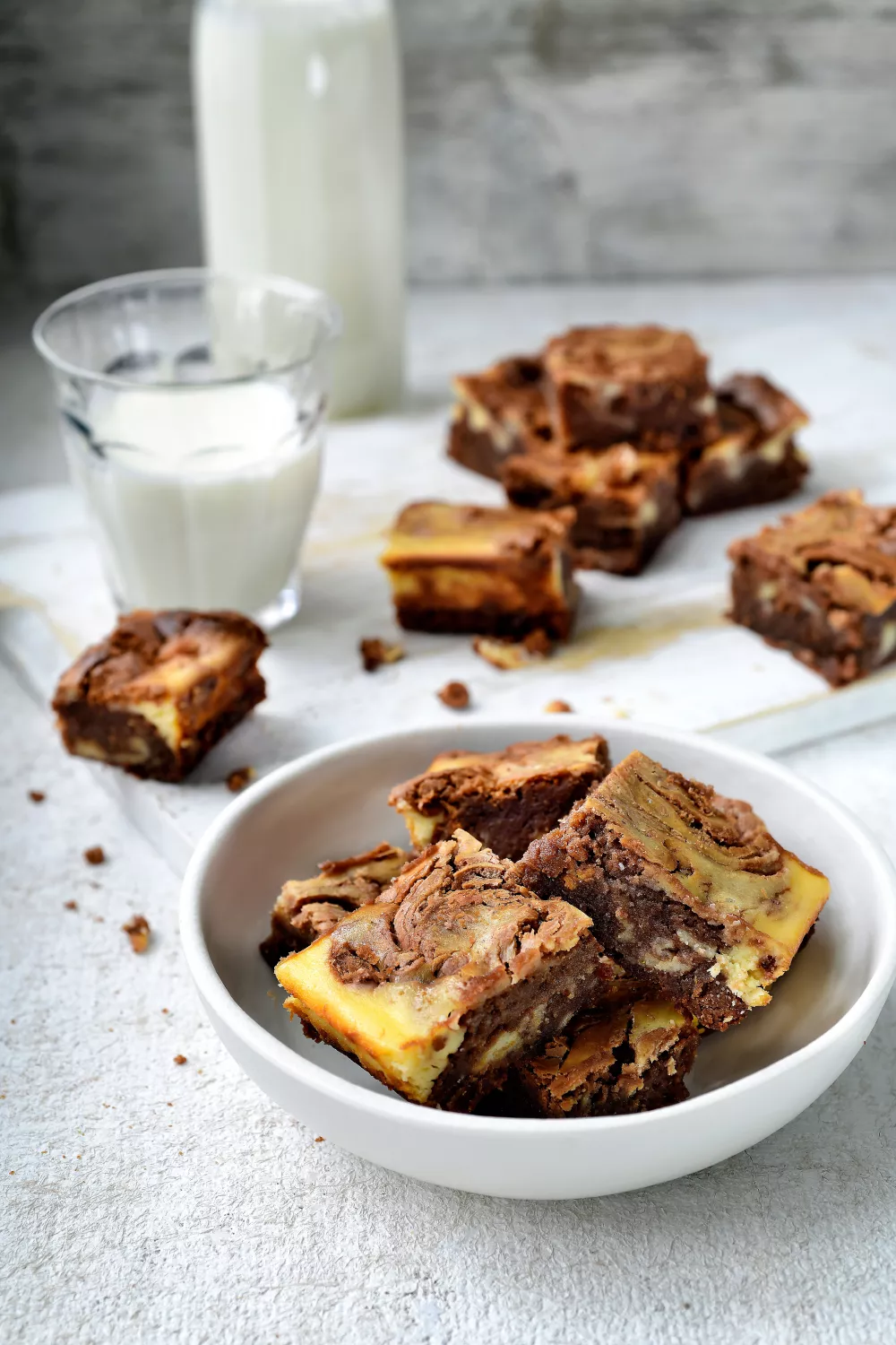Smeuïge chocoladebrownies met een romige roomkaasmarmering: melkchocolade en boter zorgen voor een fudgy basis die wordt afgetopt met een fluweelzacht cheesecakemengsel. Met suiker, eieren en bloem maak je snel het browniebeslag en de roomkaasvulling wordt op het deeg geschept en met een vork gemarmerd. Ideaal als dessert of feestelijke traktatie, even laten afkoelen voor mooie blokjes.