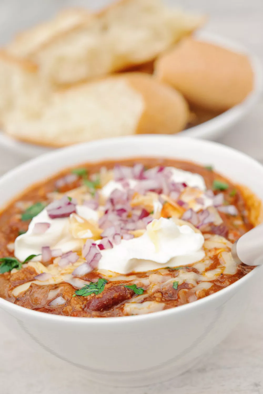 Garneer de chili met koriander, fijngehakte rode ui, geraspte kaas en zure room.