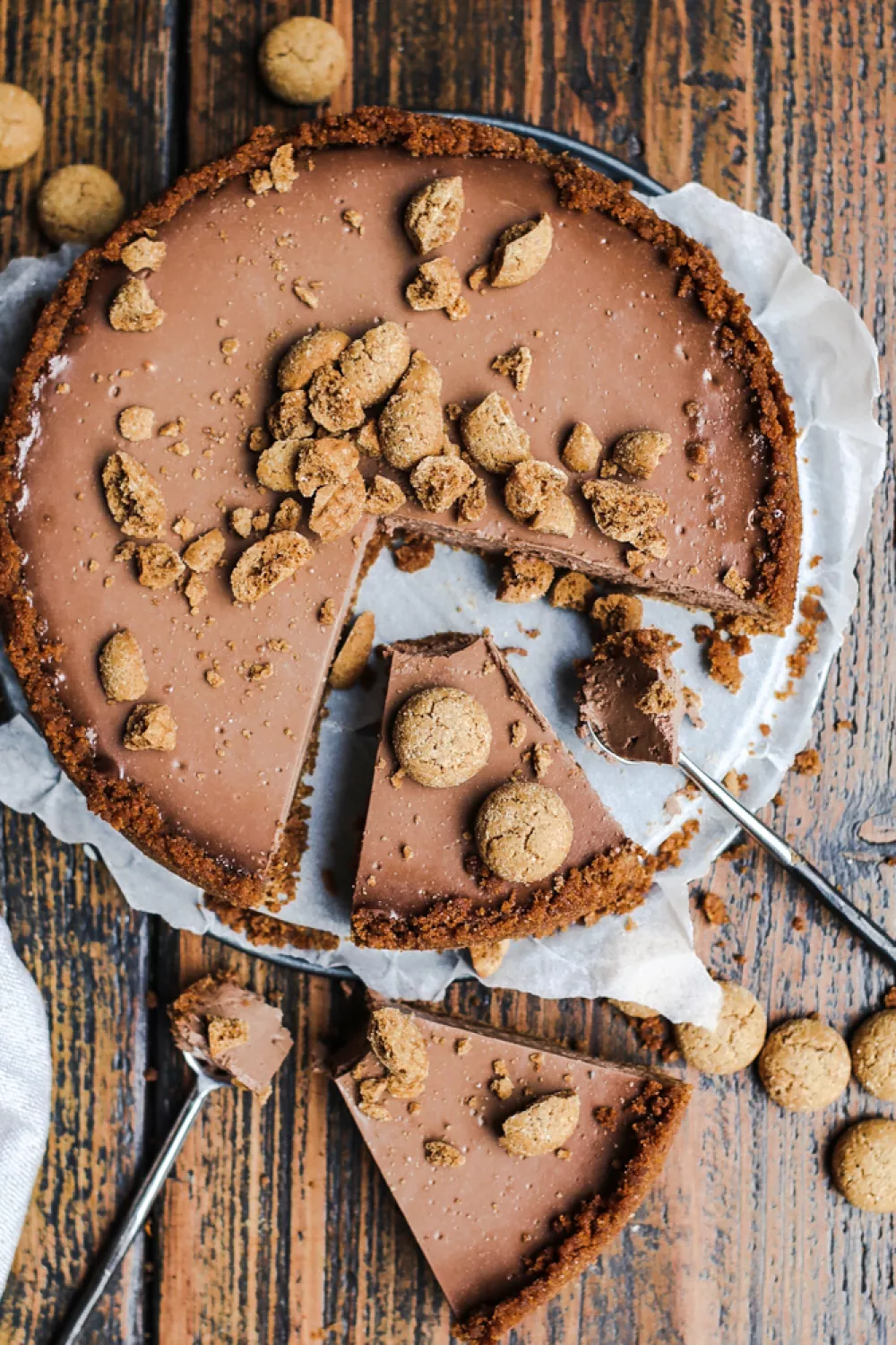 Laat de cheesecake afkoelen en zet de taart daarna minimaal 2 uur in de koelkast. (Het lekkerst is hij wanneer je hem een dag van te voren maakt!) Versier de chocolade cheesecake voor het serveren met gehakte pepernootjes.