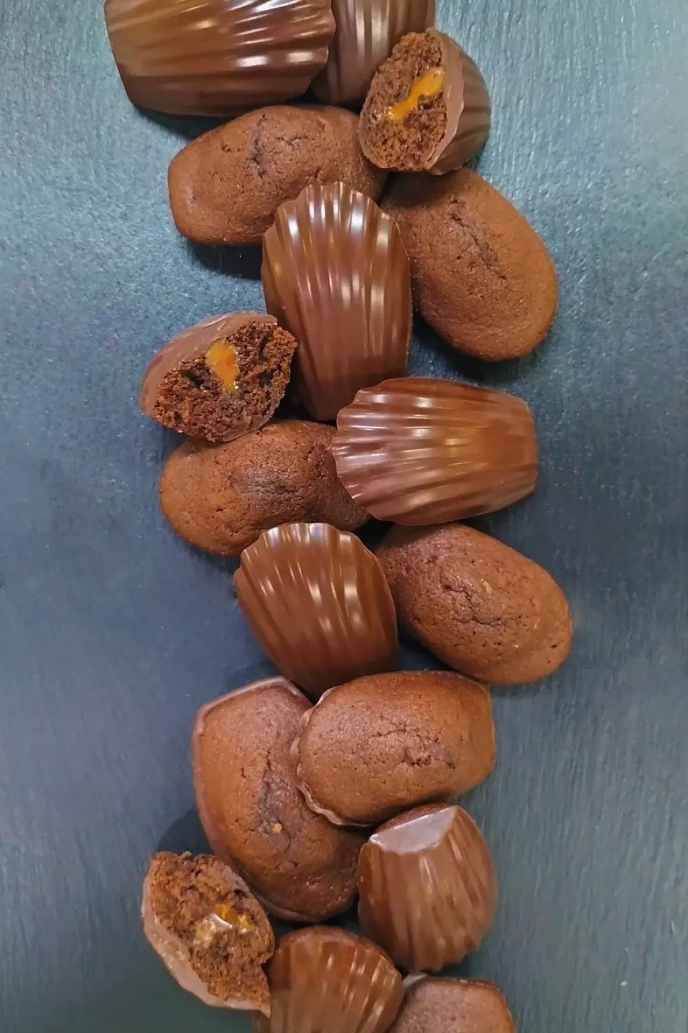 Chocolade madeleines gevuld met zachte gezouten karamel en een frisse toets sinaasappelzeste zijn een elegante traktatie voor bij koffie of als feestelijk dessert. Het recept werkt met een gekoeld beslag en een thermische schok in de oven voor het typische heuveltje, waarna je de koekjes vult met romige karamel en afwerkt met glanzende, getempereerde fondant chocolade. Ideaal voor herfstige of winterse bakmomenten en speciale gelegenheden.