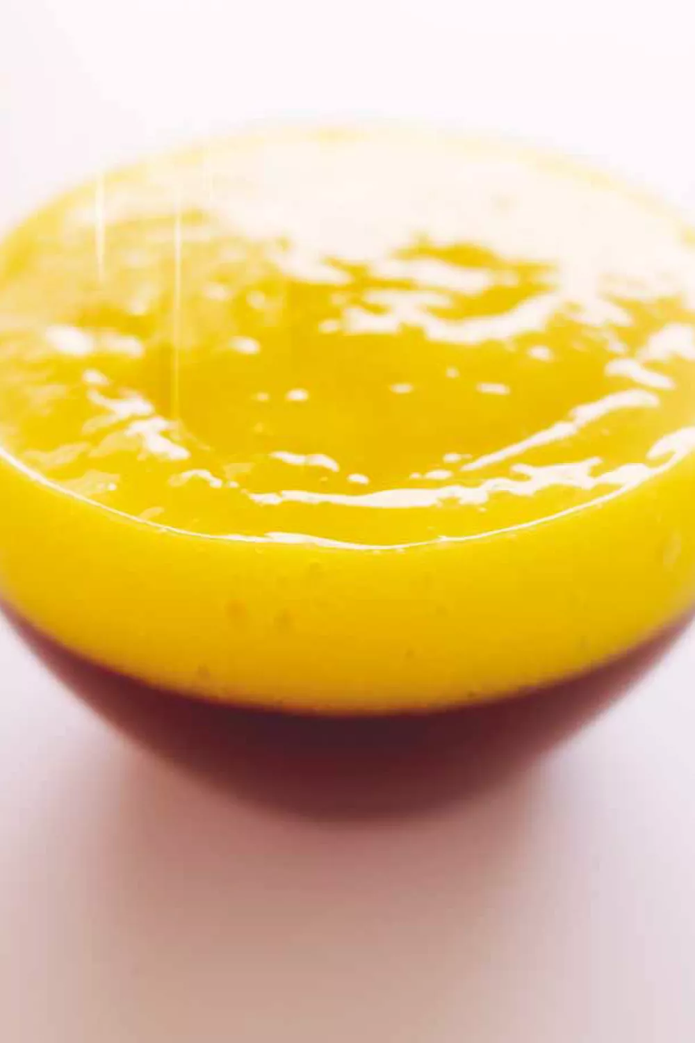 Schil de mango, snij hem in stukken en doe in de blender. Wanneer de panna cotta is afgekoeld en opgesteven, giet je er een laagje mangocoulis over.