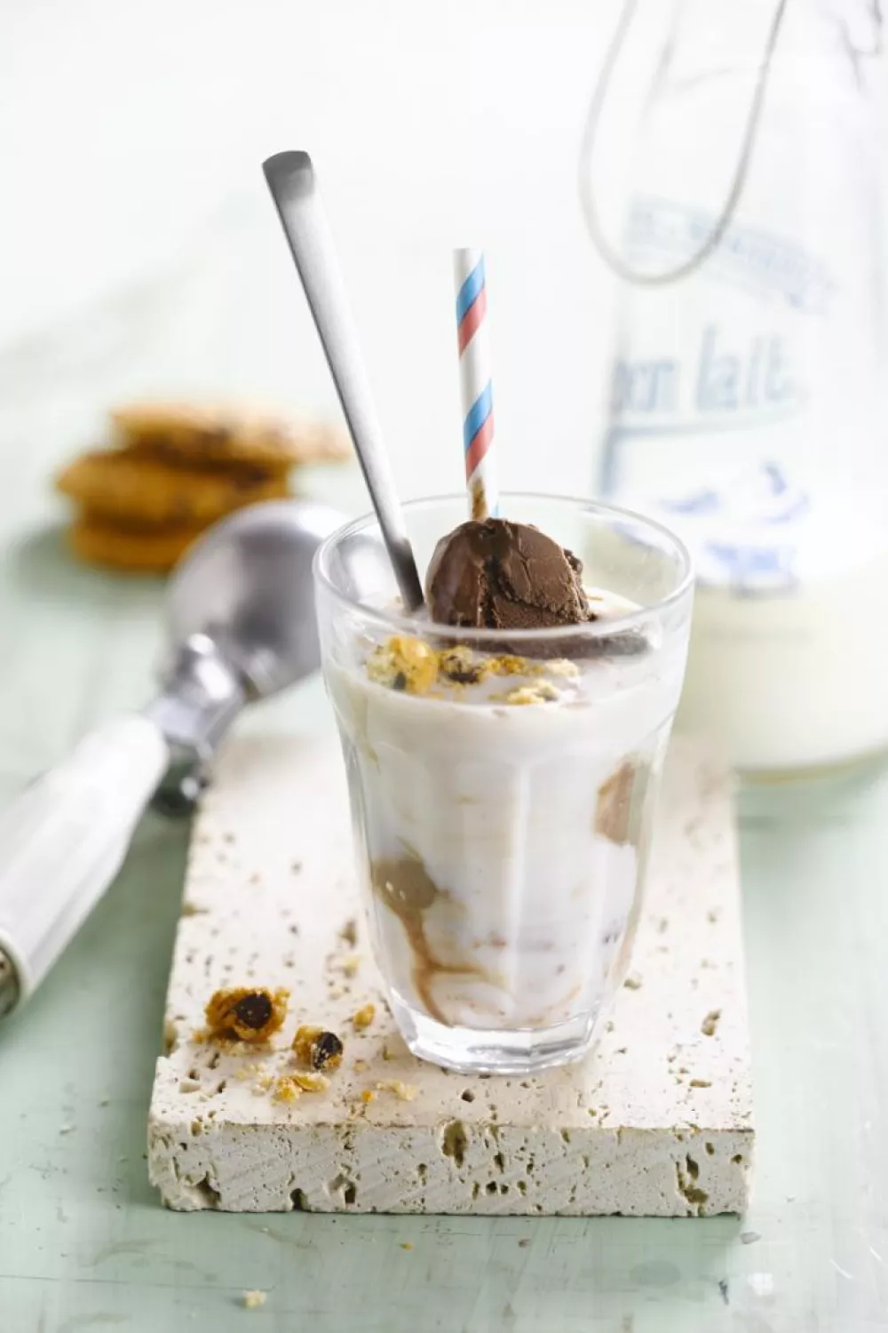 Meng het vanille-extract door de ijskoude melk. Breek de chocoladekoekjes in kleine stukjes en verdeel ze net voor het serveren over de gekoelde glazen. Leg er chocolade-ijs uit een vormpje op en overgiet met de melk. Meng goed.