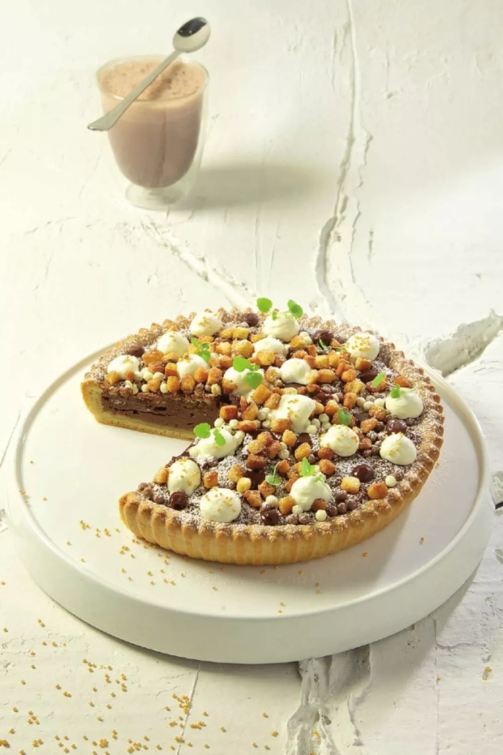 Een decadente chocoladetaart met romige hazelnootpasta en fluweelzachte banketbakkerscrème, perfect voor wie van rijke chocolade en smeuïge texturen houdt. De vulling combineert gesmolten melkchocolade met chocopasta en wordt gebakken in een licht gerezen deegbodem, afgewerkt met krokante briochecroutons en lobbig geklopte slagroom. Ideaal als feestelijk dessert of gezellig winterse traktatie, met klassieke patisserie-technieken die je thuis uitvoert.