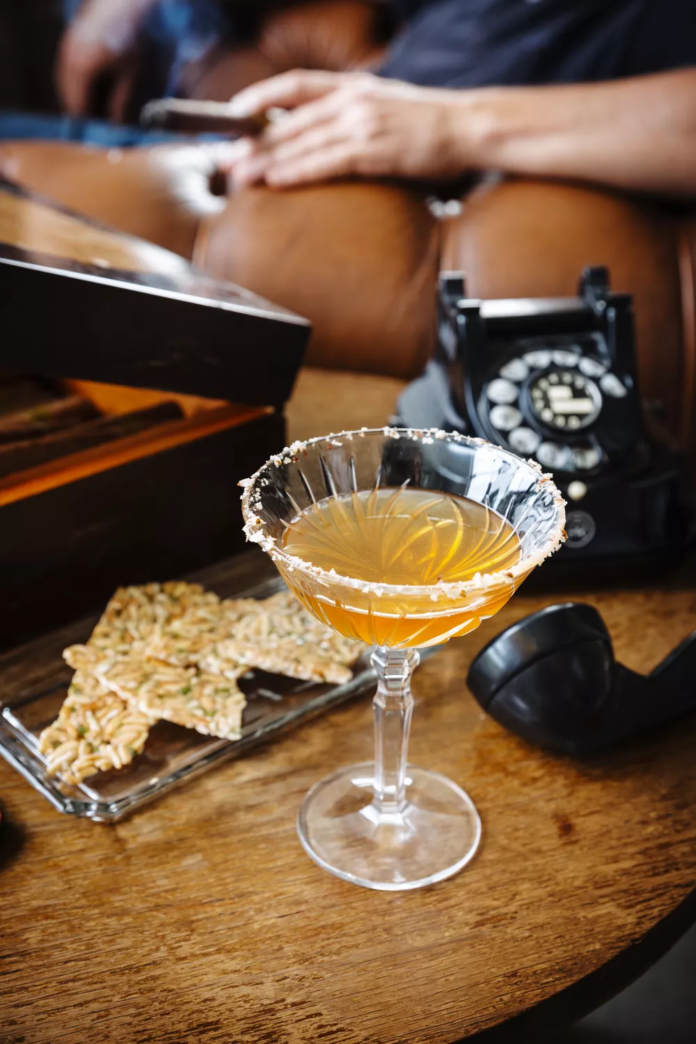 Rokerige whisky en mescal ontmoeten rijke oloroso sherry in een elegante cocktail, geserveerd met krokante amandelcrackers met rozemarijn. Technieken als het roosteren van noten, lang roeren met een barlepel en het draaien van een citroenzeste geven diepe aroma's en een subtiel bittersaandoortje. Perfect als verfijnd aperitief bij een gezellige borrel of herfstige avond.