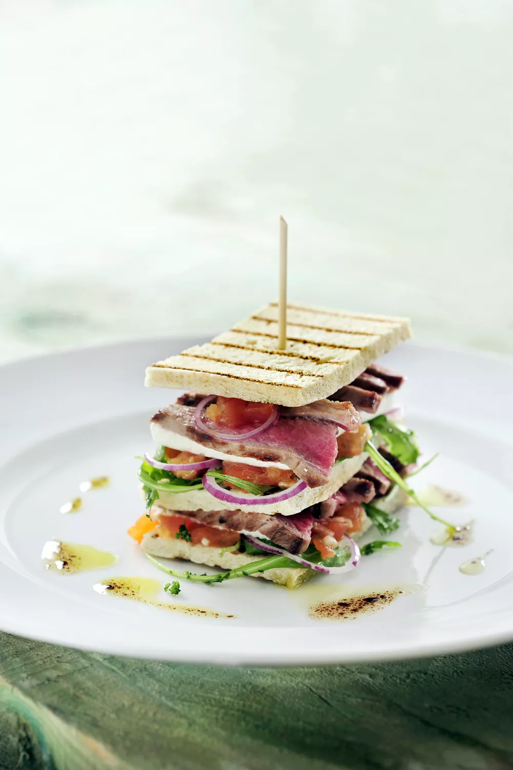Deze luxe club sandwich combineert rosé gebraden lamsgebraad met zoute fetakaas, pittige rucola en een warme tomatensalsa voor een stevige lunch of feestelijke borrel. De sneetjes toast worden knapperig gegrild terwijl tomaat, ui en witte wijnazijn zachtjes worden gestoofd en afgekoeld. Laag na laag opbouwen levert een kleurrijke, mediterrane smaakexplosie die ook bij een zomerse picknick indruk maakt.