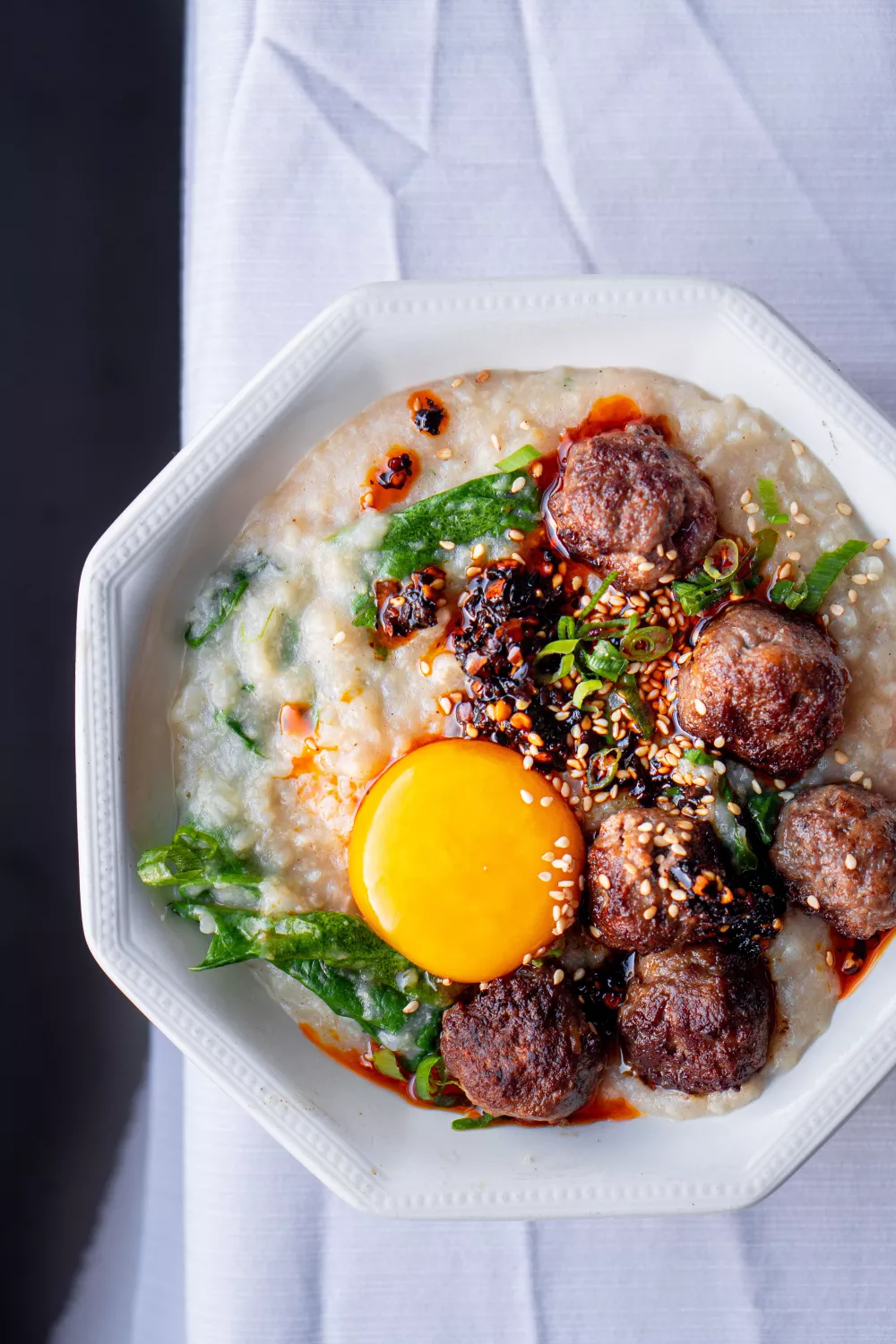 Romige congee met spinazie en sappige gehaktballetjes brengt Aziatische comfortfood op tafel met de aromatische combinatie van pandanrijst, gember en Shaoxing rijstwijn. De rijst wordt langzaam gesudderd tot een zijdeachtige pap terwijl beetgare spinazie erbij wordt geroerd en kleine balletjes in sesamolie goudbruin worden gebakken. Afgewerkt met gepekelde eidooiers, chili‑olie en zwarte sesamzaadjes is dit gerecht perfect als verwarmend ontbijt, doordeweeks diner of hartverwarmende lunch.