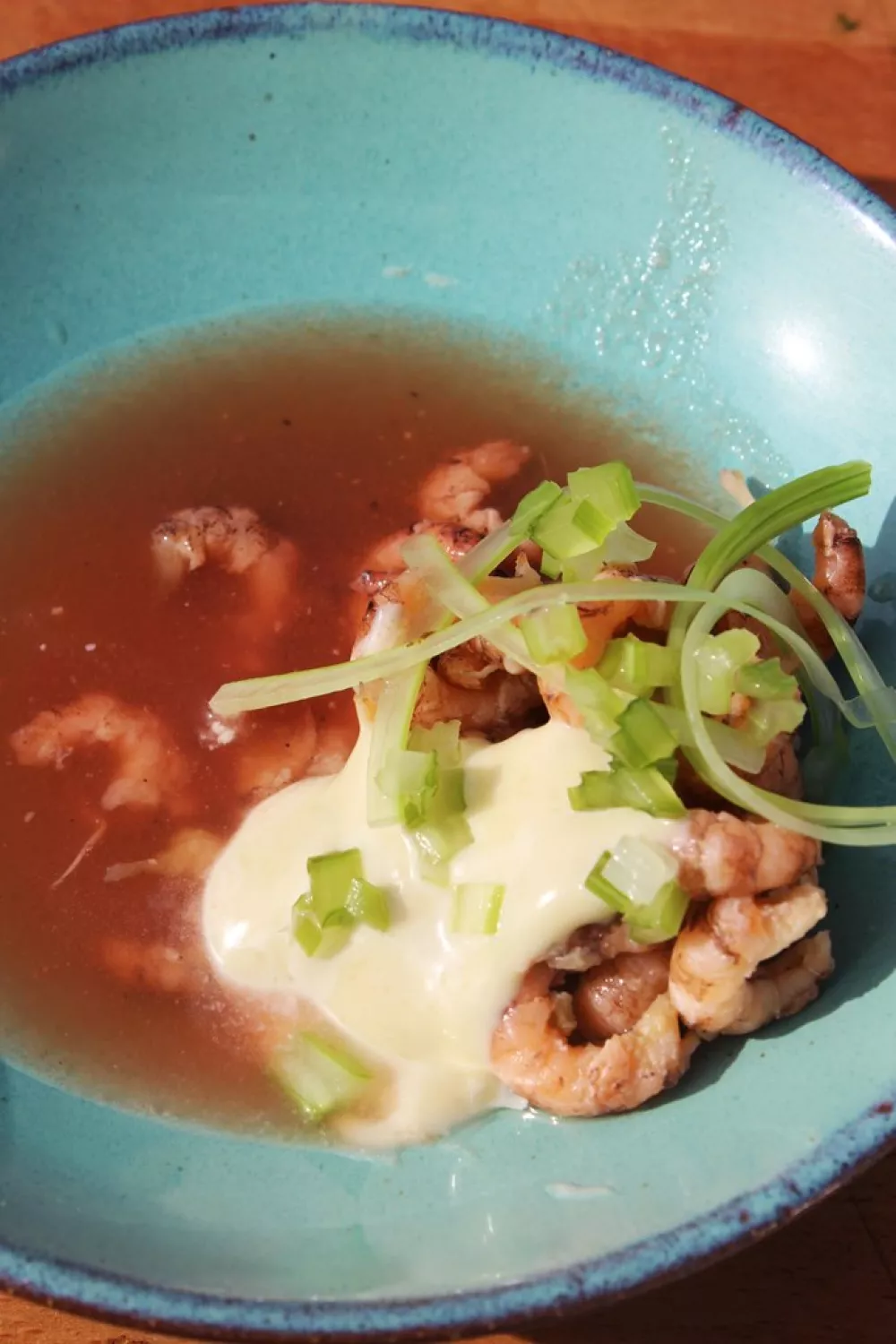 Leg een lepeltje grijze garnalen in een kommetje. Schik er wat julienne van selder en mayonaise bij. Overgiet met de consommé van tomaat.