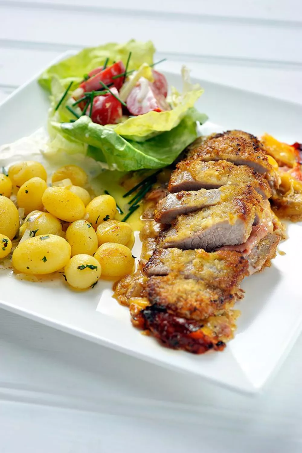Een klassieke cordon bleu met dunne kalfslapjes, ham en gesmolten kaas krijgt hier een huiselijk jasje met goudbruine gebakken aardappelen en een romig sausje van geconfijte look en bieslook. Het vlees wordt kort aangebakken en nog even in de oven gezet voor een krokante korst en smeuïge binnenzijde. Serveer met een frisse sla met kerstomaatjes en een zachte dragonvinaigrette, ideaal voor een familiediner in de herfst of als gezellige weekendmaaltijd.