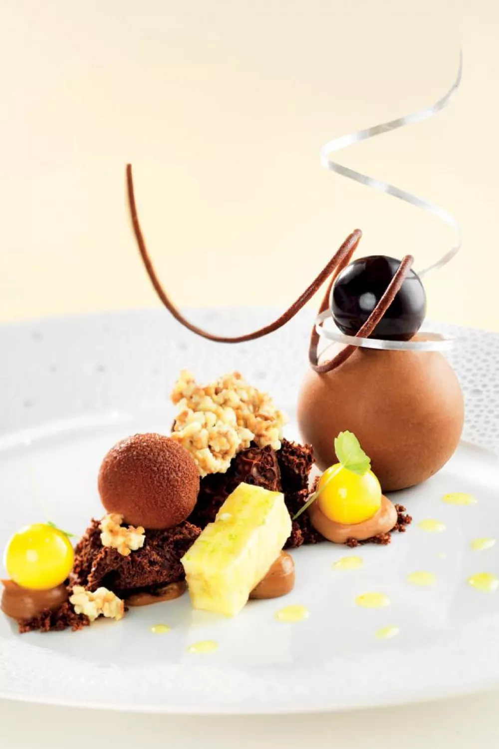 Leg de chocoladebavaroisballetjes op een bord. Strooi er een crumble van lemon myrtille en een chocoladecrumble naast. Dop de banaantjes in een crumble van noutgatine en schik mooi op het bord. Haal de kalamansicrémeuxballetjes door een heldere gelei en leg bovenop de bavaroisballetjes. Werk af met zoethout, rotsjes, enkele tuilles en suikerringen.
