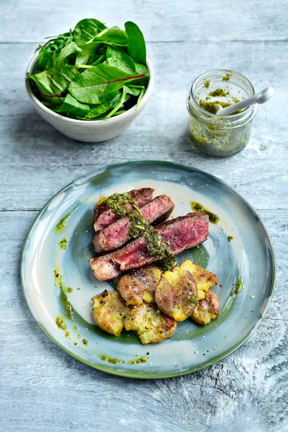Een malse côte à l'os met knapperige smashed potatoes en een fris kruidensausje van peterselie, oregano, citroen en knoflook is het perfecte hoofdgerecht voor een gezellige weekendmaaltijd. Gekookte krieltjes worden platgedrukt en in boter en knoflook geroosterd in de oven terwijl het rundsvlees kort in olijfolie en boter wordt gebakken tot de gewenste garing, afgewerkt met een snufje chilivlokken voor extra pit.
