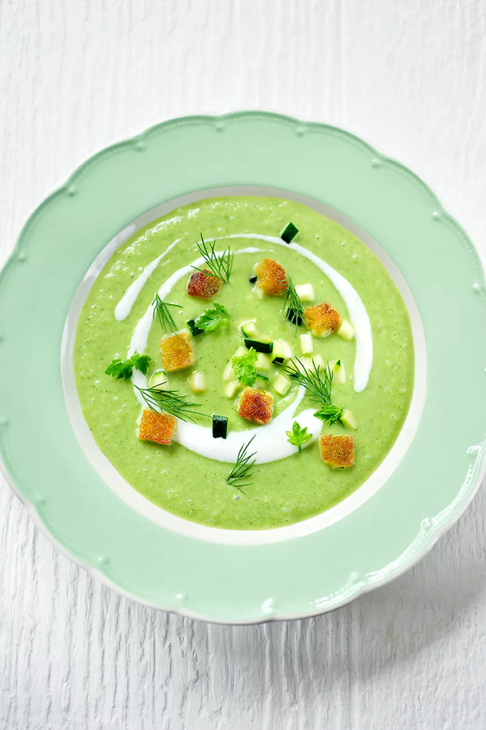 Courgettesoep met verse kruiden en knapperige broodcroutons