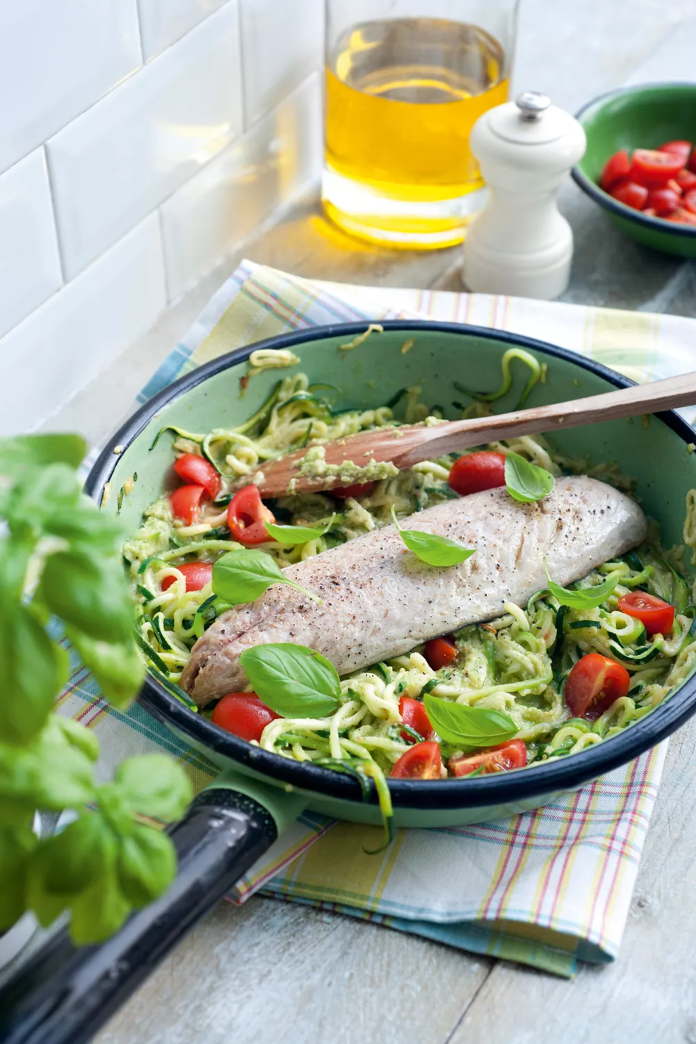 Meng de pesto nu onder de courgetti. Schik de kerstomaatjes er mooi bovenop en serveer samen met de makreel. Werk af met een blaadje basilicum.