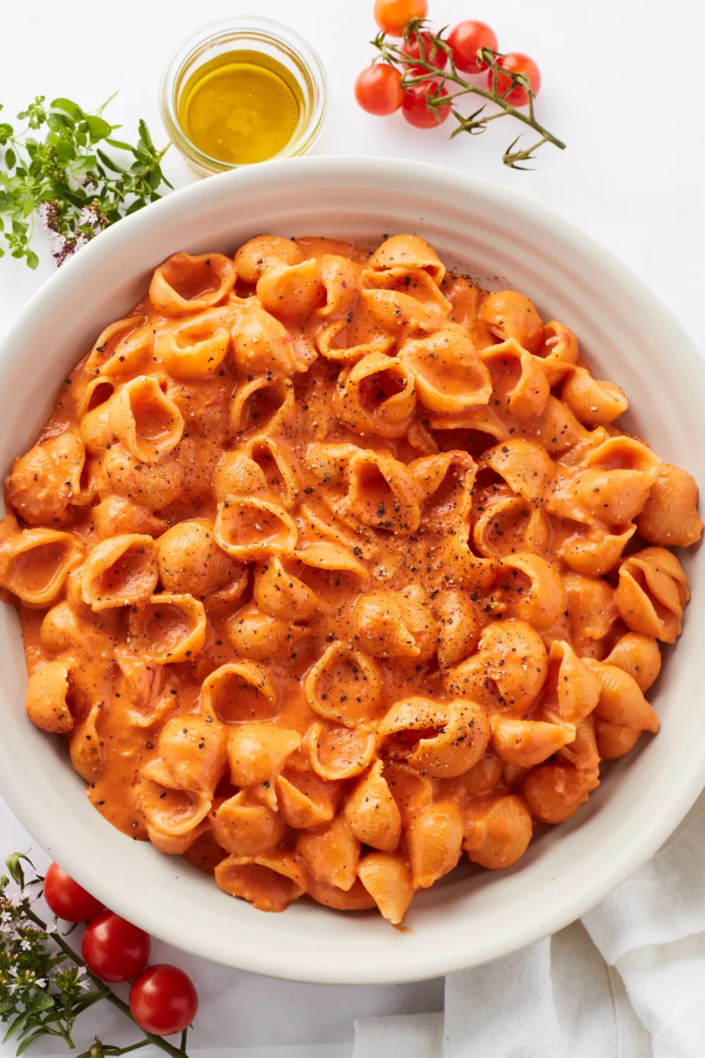 Een romige pasta met sappige kerstomaatjes, mascarpone en Parmezaanse kaas die zomerse frisheid combineert met hartige comfortsmaken. De saus wordt zachtjes gestoofd met ui, knoflook, tomatenpuree en tomatenblokjes en daarna met de staafmixer tot een fluweelzachte saus gemengd. Een scheutje pastawater maakt het geheel extra romig, ideaal voor een snelle doordeweekse maaltijd of een gezellige etentje.
