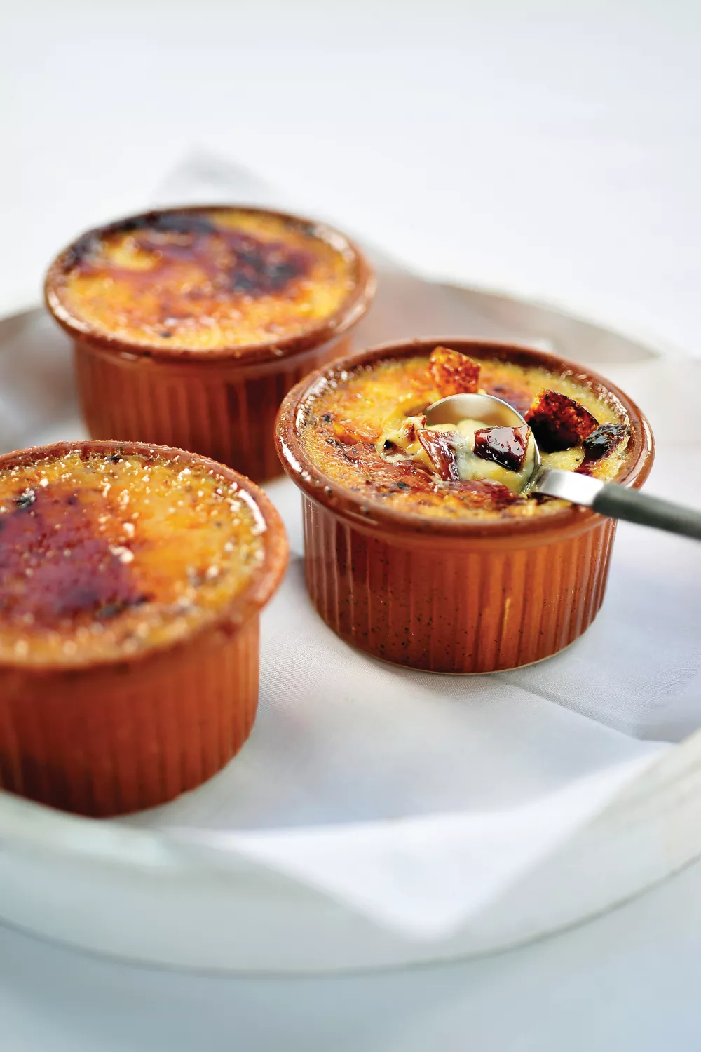 Bestrooi de crème brûlées met fijne suiker en karamelliseer de suiker met een keukenbrandertje.