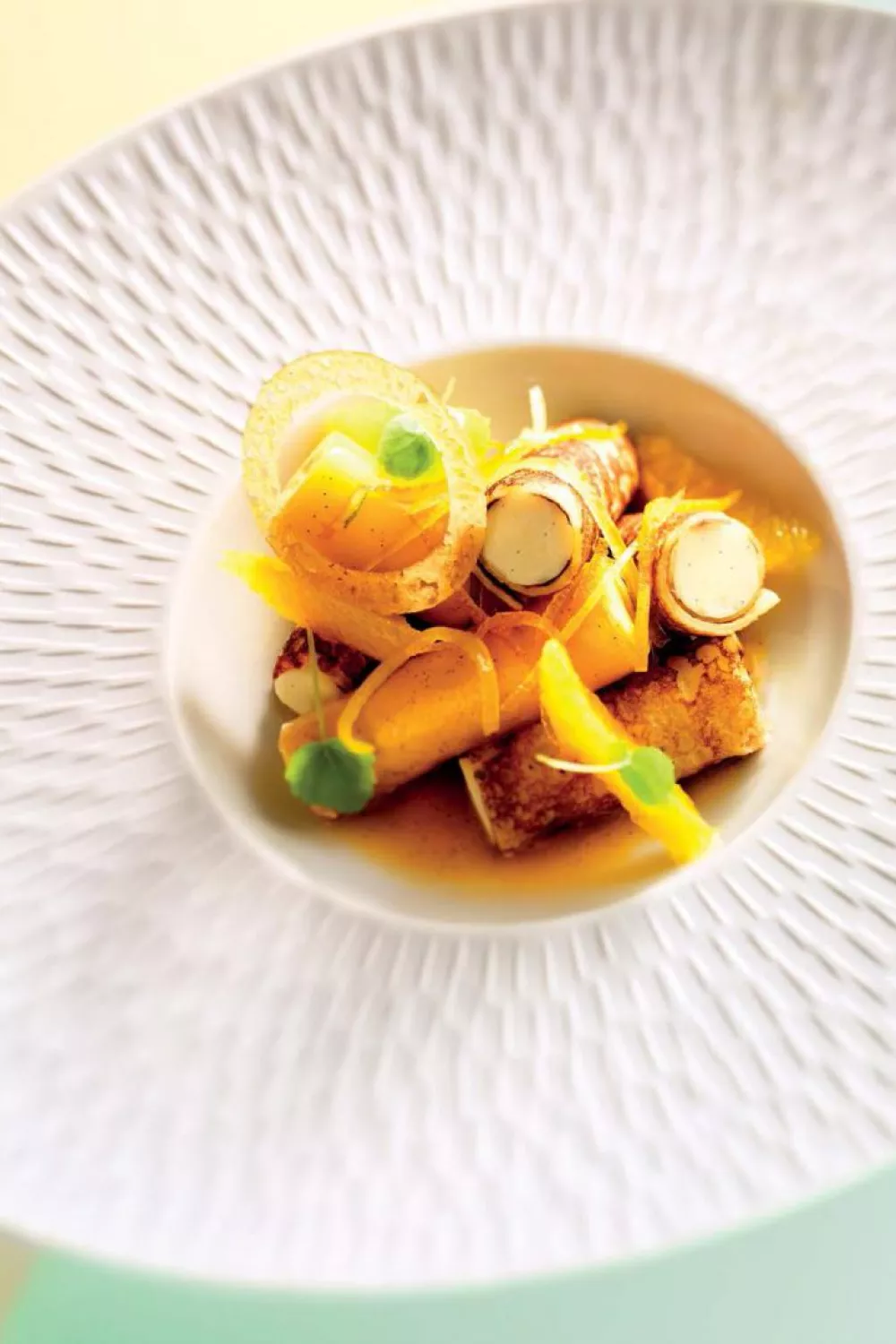 Crêpe Suzette krijgt hier een moderne twist met flinterdunne pannenkoeken, een diepe sinaasappelcoulis op Grand Marnier en Cointreau en romig vanille-ijs naast frisse passievrucht sorbet in kleine rolletjes. Karamelliseren, infuseren en ijs draaien brengen volle citrus- en vanillesmaken naar voren. Een feestelijk dessert dat perfect past bij een diner of zomerse middag.