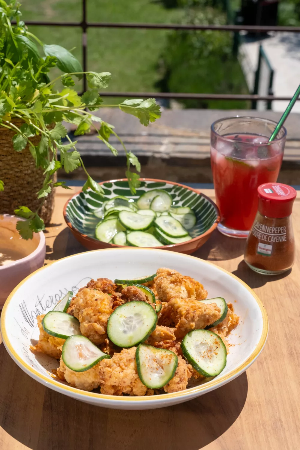 Schep de popcorn chicken in een kom. Verdeel er wat gepekelde komkommer over. Serveer met het honing-mosterdsausje.