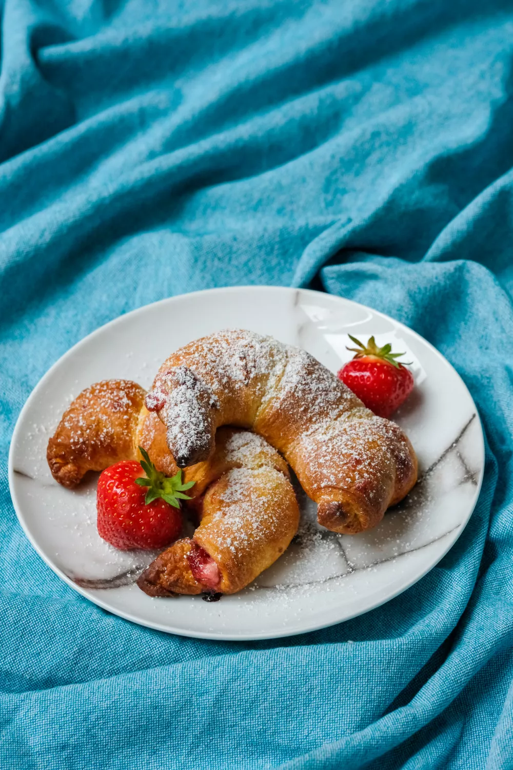 Boterzachte croissants gevuld met romige roomkaas en huisgemaakte aardbeienconfituur leveren een heerlijke mix van zoet en fris. De confituur wordt kort op zacht vuur gekookt met geleisuiker voor een volle, fruitige smaak, waarna je de driehoekjes met roomkaas en confituur oprolt en in de oven bakt tot ze goudbruin zijn. Perfect als ontbijtje, voor een gezellige brunch of als lente dessert bij koffie.