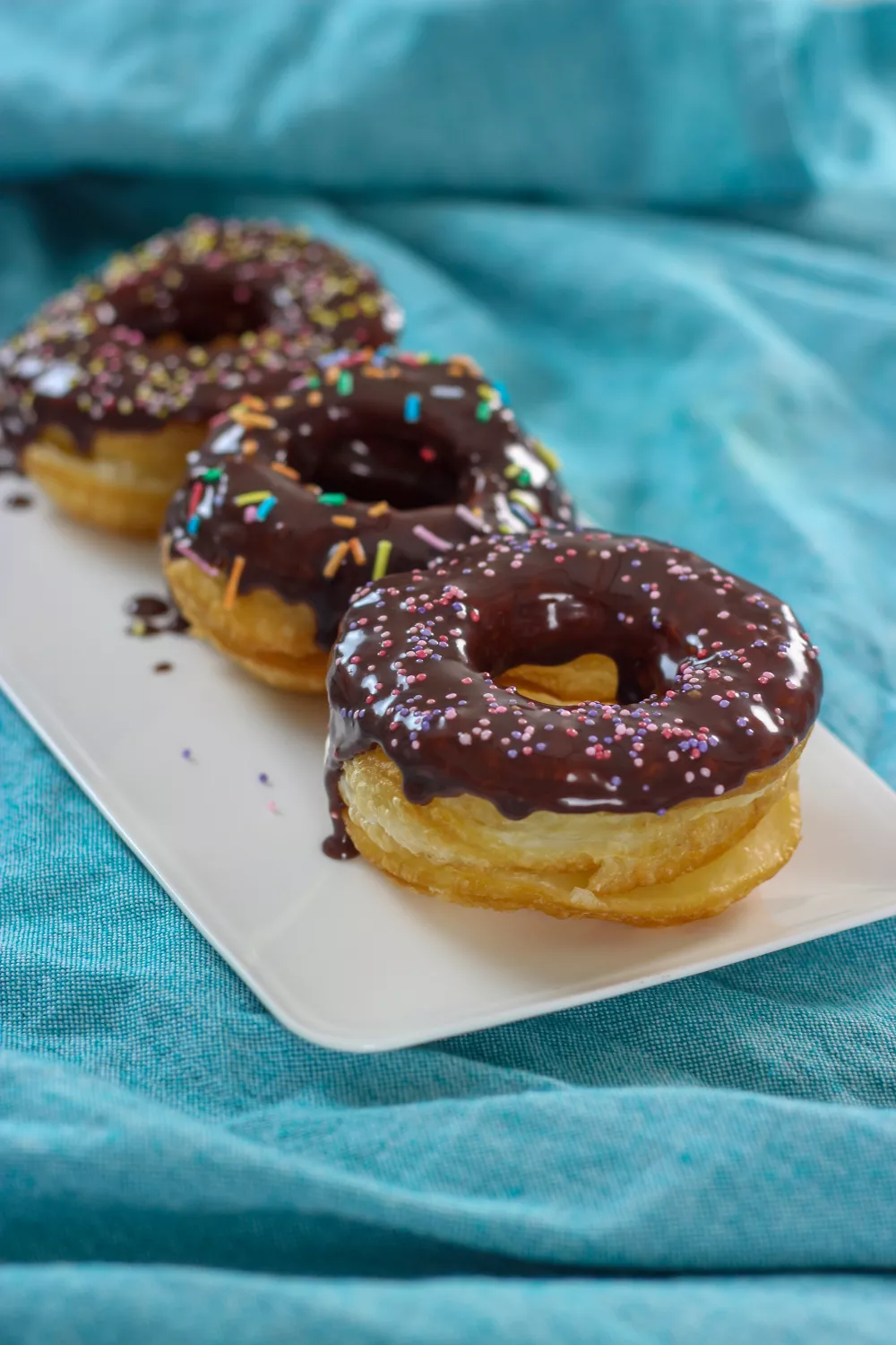 Flinterdun bladerdeeg wordt tot luxe cronuts getransformeerd door vellen op elkaar te leggen, rondjes uit te steken en goudbruin te frituren in de friteuse. Een warme room met hazelnootpasta zorgt voor een smeuïge, volle vulling waarna je de cronuts dompelt en feestelijk afwerkt met eetbare decoratie. Heerlijk als zoet brunchgerecht of als feestelijk dessert bij speciale gelegenheden.