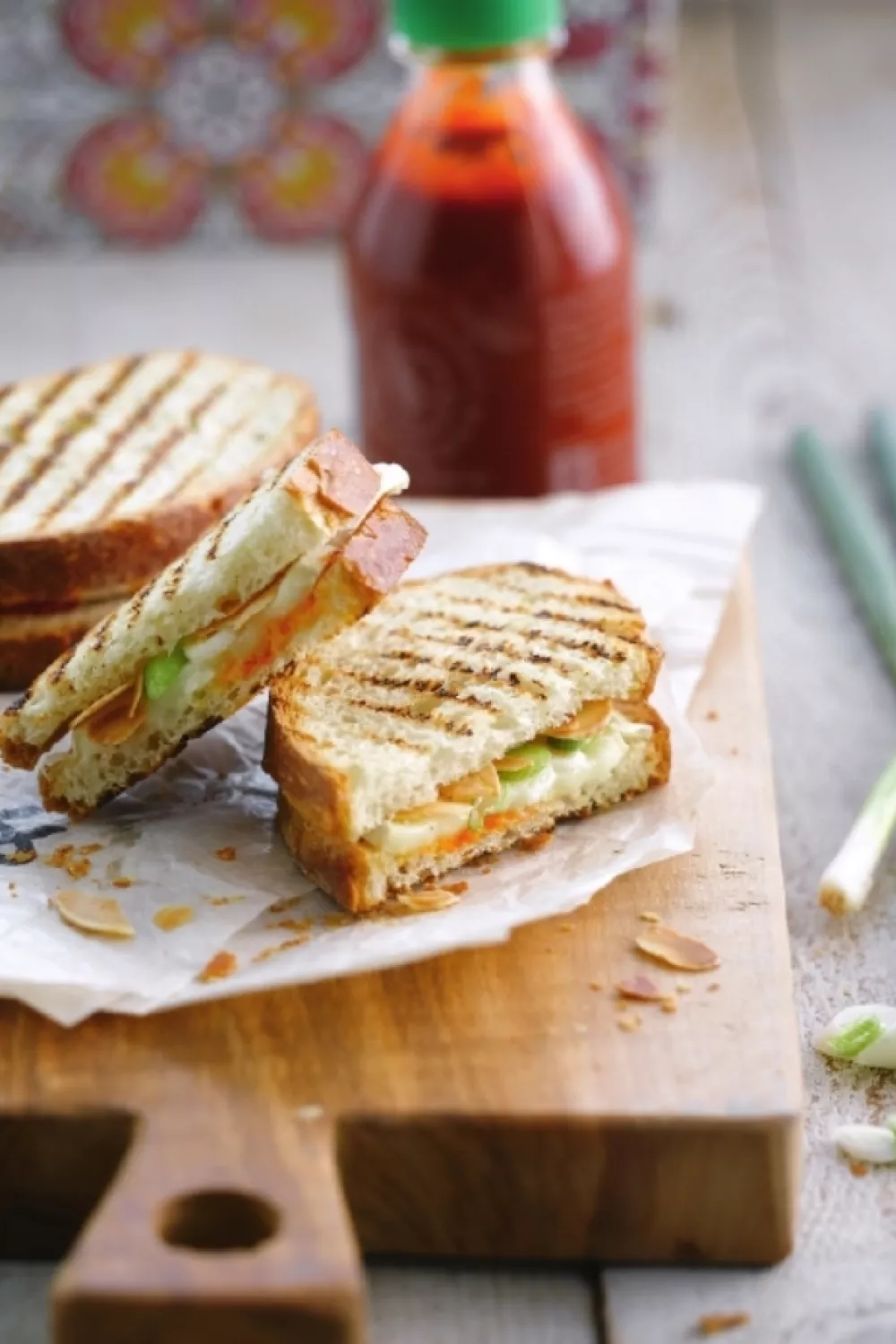 Bestrijk één snede brood met sambal oelek, strooi er fijngesneden lente-ui en geroosterde amandelschilfers op. Beleg royaal met brie. Dek af met een tweede snede.
