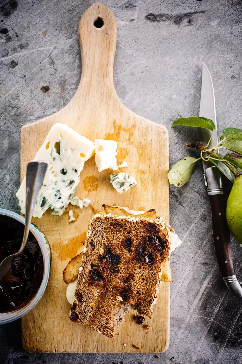 Verwarm het croque-apparaat voor. Bestrijk de sneetjes brood met de perensiroop. Verdeel de roquefort over een sneetje. Schil de peer, verwijder het klokhuis en snijd de peer in dunne plakjes. Smelt wat boter in een pan en bak de plakjes peer kort aan, laat ze op een zacht vuur verder karamelliseren. Leg de plakjes peer op de roquefort. Laat de croque mooi goudbruin kleuren in het croque-apparaat.