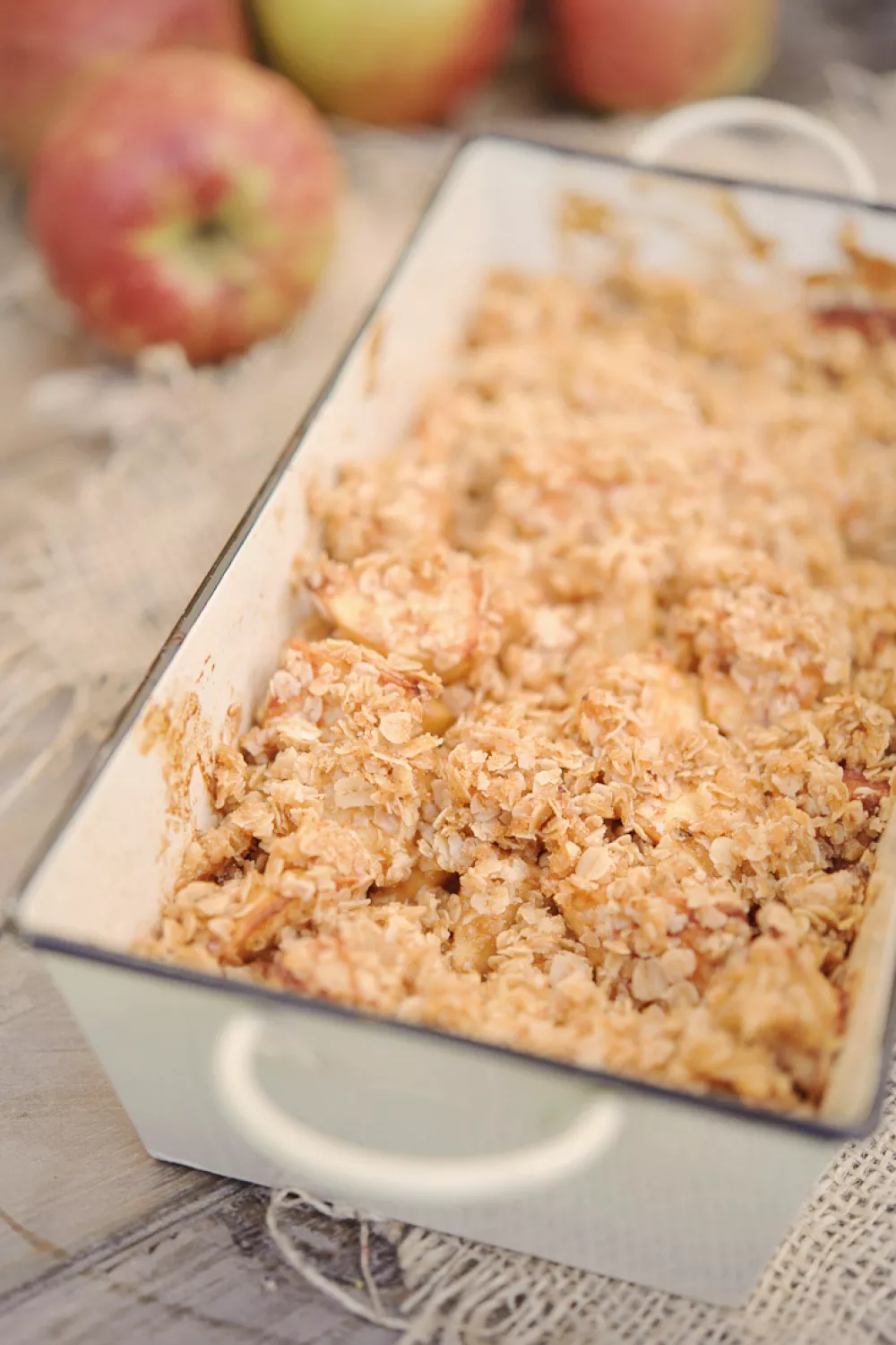 Deze ovengebakken krokante appeltjes combineren zoetzure appelstukjes met warme kaneel en een knapperige topping van havermout en bruine basterdsuiker. Het eenvoudige huiselijke dessert wordt met een vleugje citroen opgefrist en in de oven goudbruin gebakken, ideaal voor het najaar of een gezellig familiedessert. Serveer warm met een bolletje roomijs of kaneelijs voor een ultieme smaakbeleving van warmte en zoetheid.