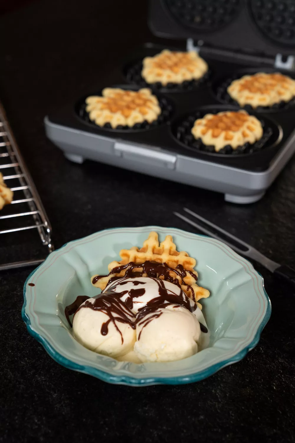 Verhit het wafelijzer en bak er goudbruine wafeltjes in.
