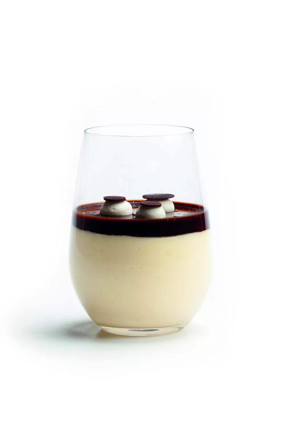 Vul een glaasje met vanille-ijs. Plaats het in de diepvriezer tot het dessert geserveerd wordt. Dek af met een laagje chocoladesaus. Spuit er enkele dopjes slagroom op. Werk af met chocoladeplakjes.