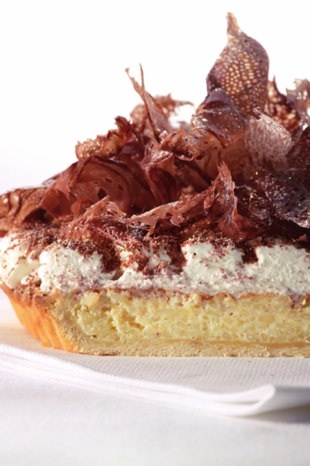 Deze romige rijsttaart combineert zacht gekruide kokosrijst met vanille en frisse limoenzeste op een huiselijk boterdeeg, ideaal als feestelijk dessert of zomers gebak. De rijst wordt langzaam gegaard in kokosmelk met citroengras en limoenblaadjes en daarna verrijkt met banketbakkersroom voor een volle, fluweelzachte vulling. Het recept vraagt om gistdeeg uitrollen, kruiden infuseren en de vulling laten opstijven, waarna opgeklopte room en chocoladeschaafsel het geheel afmaken.