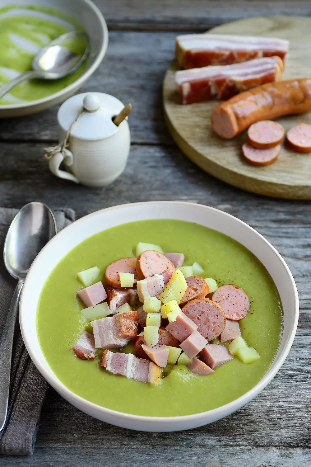 Romige dikke erwtensoep boordevol verse erwtjes, prei, ui en aardappel, verrijkt met blokjes spek, kookham en traditionele rookworst. De groenten worden zacht gestoofd in runderbouillon en daarna gepureerd tot een fluweelzachte soep, perfect voor koude winterdagen, een stevige lunch of een gezellig familiediner.