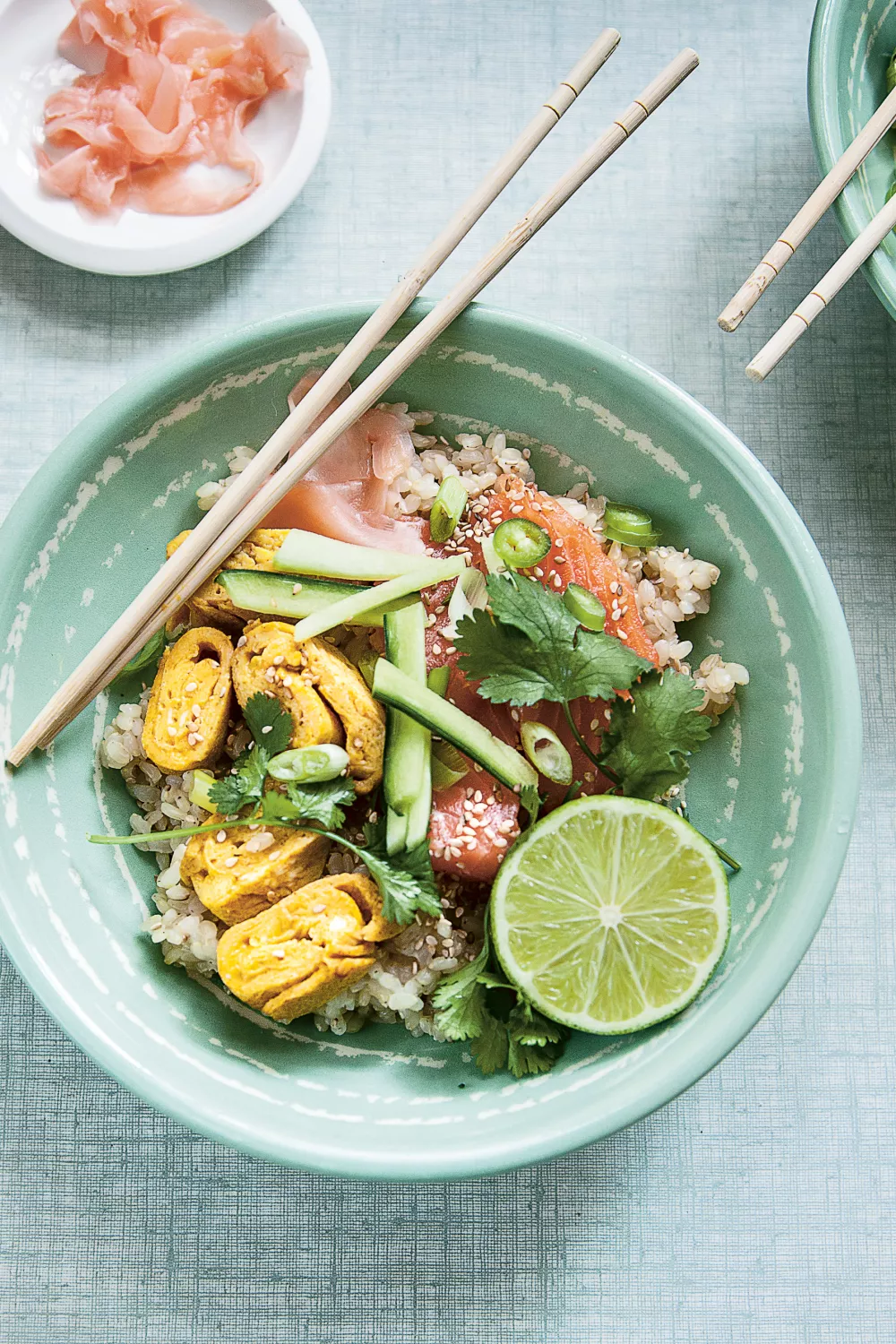 Deze frisse donburi met rauwe forel en een zachte Japanse omelet combineert zilvervliesrijst met rijstazijn, sesam en ingelegde gember voor een lichte, smaakvolle Aziatische maaltijd. De opgerolde omelet krijgt zijn zijdezachte textuur door herhaaldelijk uitgieten en rollen in de pan, terwijl de warme gemarineerde rijst de smaken samenbrengt. Ideaal als snelle lunch of zomers diner met limoen, koriander en lenteui.