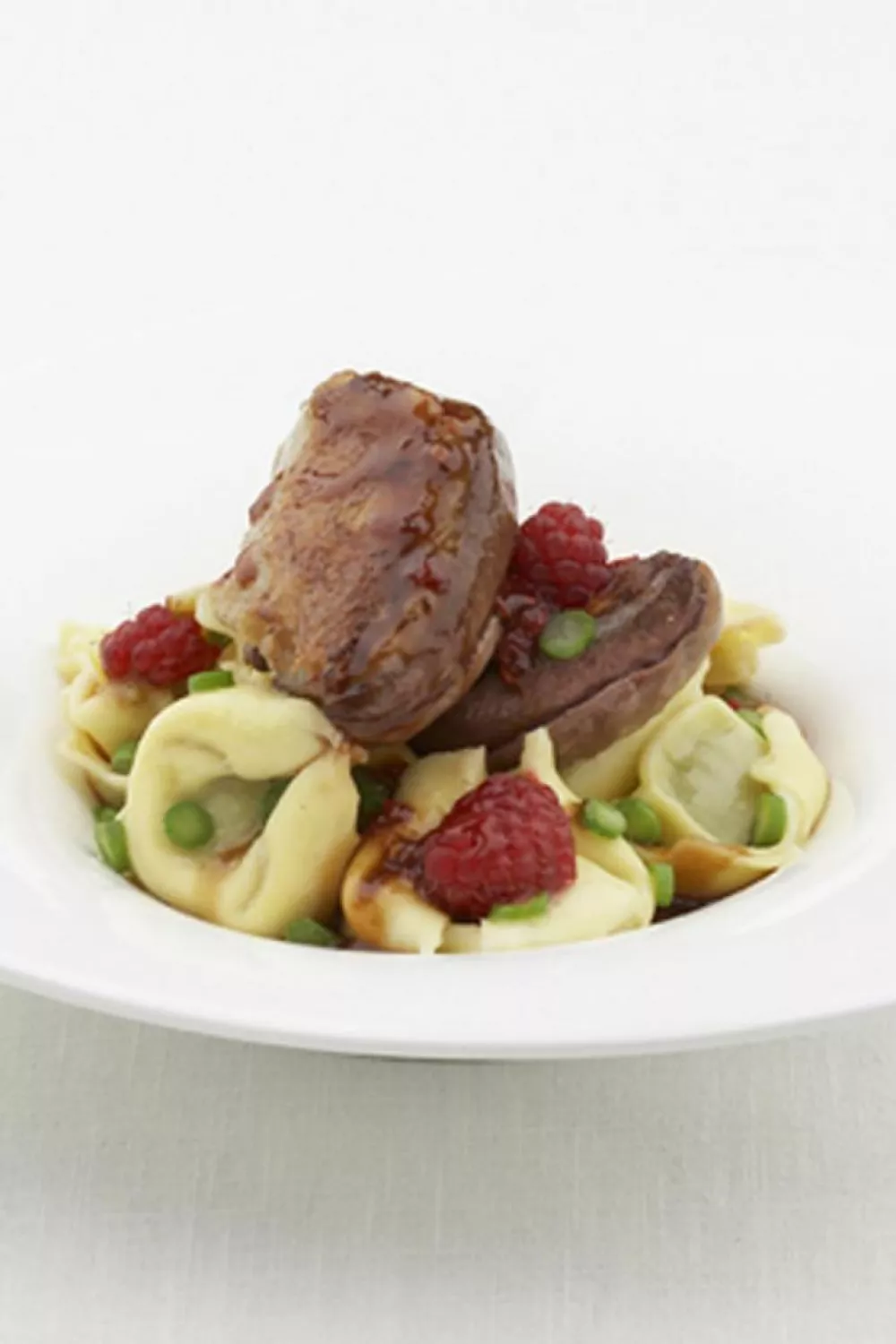 Serveer de duivenfilets met de saus, de boontjes en wat ravioli.