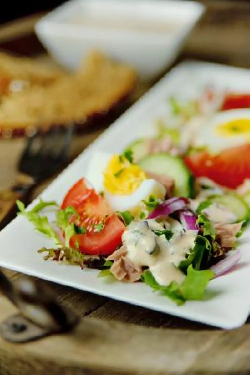 Frisse, kleurrijke salade met tonijn, hardgekookte eitjes, tomaat en komkommer, afgewerkt met een romige duizend eilanden dressing met zoete chilisaus, augurk, rode ui, look, olijven en peterselie. De dressing pureer je in een handomdraai met de staafmixer. Perfect voor een zomerse lunch, picknick of licht avondmaal en heerlijk met grof bruin brood.