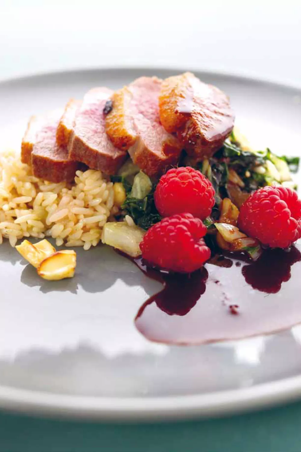 Eend met frambozen, gestoofde paksoi en kruidenrijst