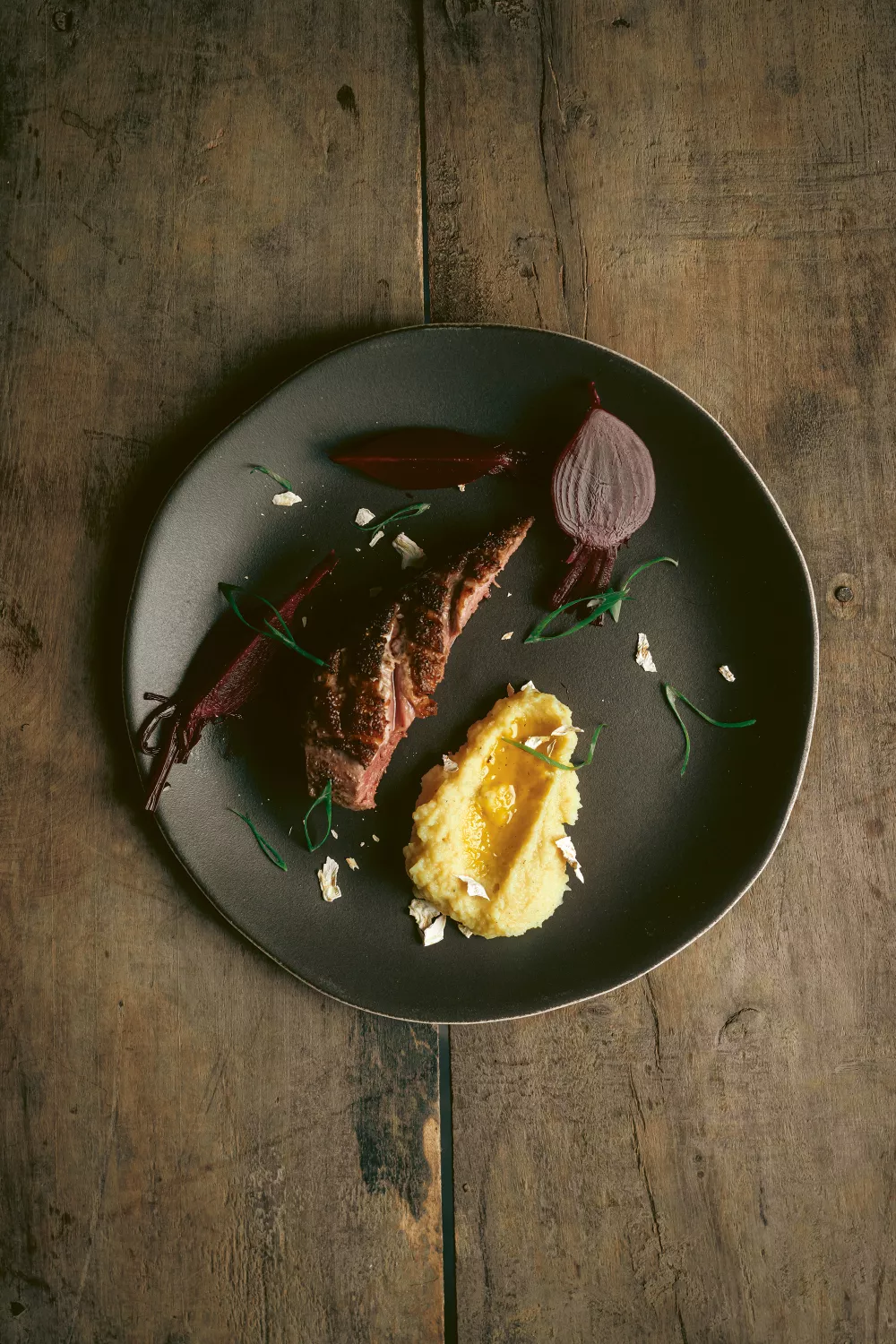 Eend met knolselderpuree, gepekelde bietjes en saffraansiroop