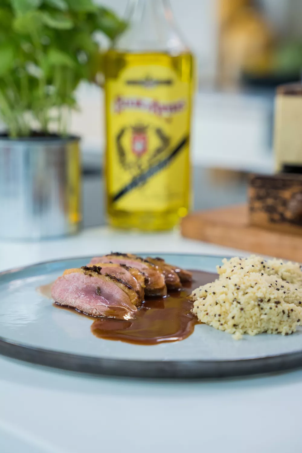 Sappige eendenborst met limoencouscous en een glanzend honing en passievruchtglazuur, gekruid met koriander, komijn en venkel. Het vlees wordt krokant aangebakken terwijl de saus wordt ingekookt en gezeefd voor een diepe, zoetzure smaak. De couscous krijgt frisse limoenzeste en poppende mosterdzaadjes, ideaal voor een feestelijk diner of een zomerse avond vol Aziatisch getinte smaken.
