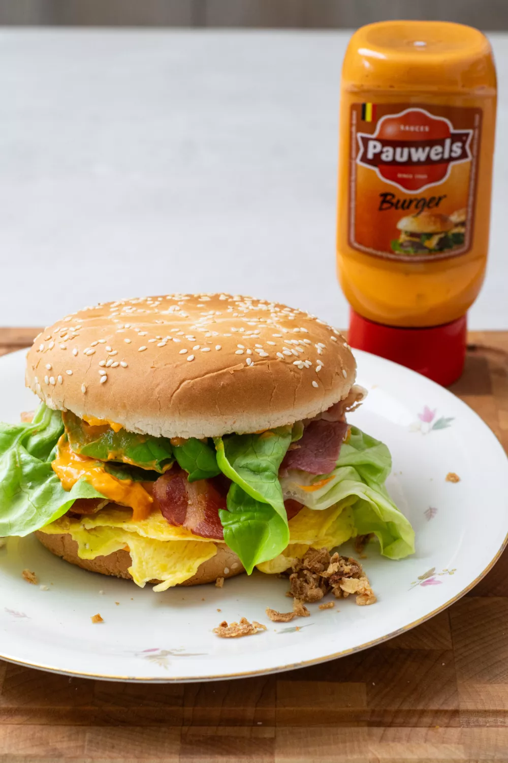 Deze burger met ei en gerookt spek combineert romig ei, krokant gebakken spekreepjes en hartige burgersaus op een luchtig hamburgerbroodje. Met Pauwels mayonaise, krokante uitjes en frisse kropsla krijgt hij extra textuur en smaak. Spek en eieren garen snel in de magnetron, waardoor dit recept ideaal is voor een snelle lunch, weekendbrunch of zomerse picknick.