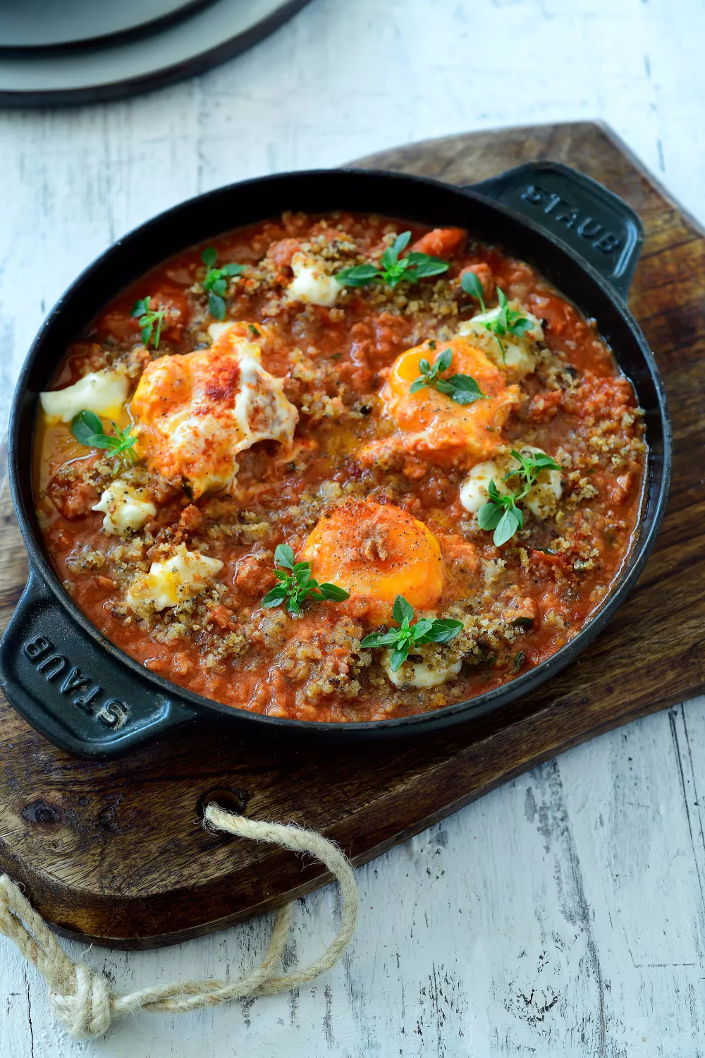 Romige eieren in een pittige tomatensaus met salciccia, venkel en gesmolten mozzarella vormen een warm eenpansgerecht boordevol smaak. De knoflook en venkelzaadjes worden kort aangefruit met chilivlokken voordat de tomaten rustig sudderen en de eieren onder een deksel zachtjes garen. Ideaal als stevige brunch, doordeweeks comfort food of gezellige wintermaaltijd, afgemaakt met krokant broodkruim en verse basilicum.
