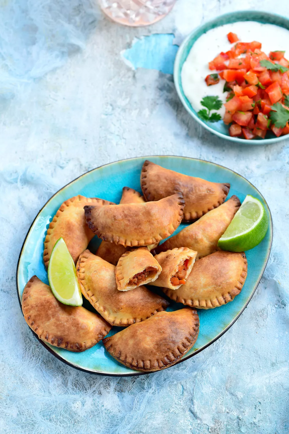 Knapperige empanadas met kruidig kalkoengehakt, paprika en chili, op smaak gebracht met komijn, korianderzaad en oregano voor een warme, licht pittige bite. Ze worden eenvoudig gevuld met zanddeeg, dichtgevouwen tot halve maantjes en goudbruin gebakken in de oven. Serveer met frisse tomatensalsa, zure room, koriander en limoenpartjes als borrelhap of lichte lunch.