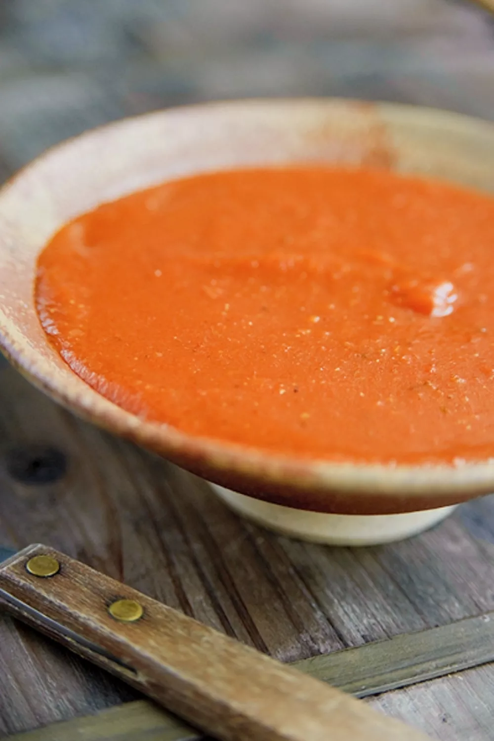Meng de knoflook, gedroogde ui, oregano, komijn met de tomatenstukjes en bouillon. Blender of pureer met een staafmixer tot een gladde saus.