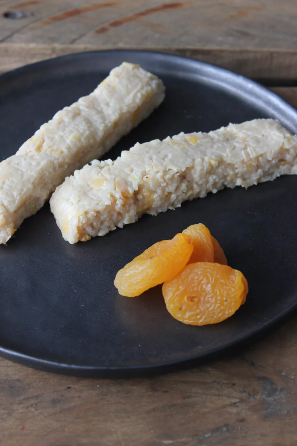 Zachte energierepen van romige dessertrijst met zoete gedroogde abrikozen en exotische kokosmelk geven een subtiele tropische smaak aan je tussendoortje. Met palmsuiker en een vleugje geplet citroengras worden ze tijdens zacht sudderen gaar en kruidig, waarna je de massa laat opstijven en in repen snijdt. Perfect als voedzaam ontbijt, picknick snack of zomers tussendoortje en makkelijk Aziatisch geïnspireerd aan te passen met rijstmeel voor stevigere repen.