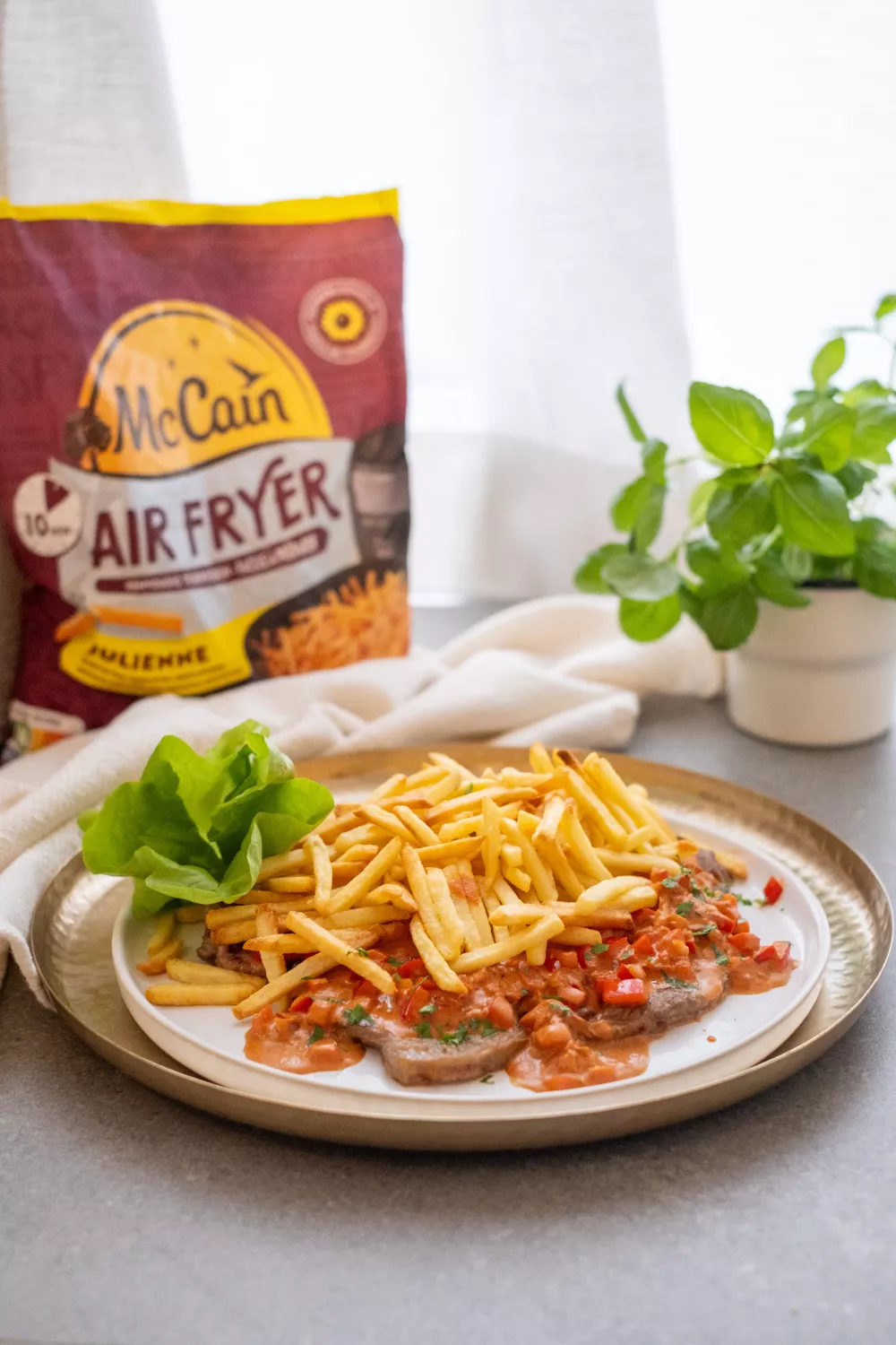 Een sappige entrecote met romige stroganoff en krokante juliennefrietjes uit de airfryer is een stevig hoofdgerecht dat zowel doordeweeks als bij een gezellig diner met vrienden smaakt. De pangebakken biefstuk krijgt diepgang door sjalot, paprika, room en kalfsbouillon, met een subtiele pittigheid van cayenne en paprikapoeder. Perfect voor herfst en winter, serveer met frisse sla voor balans.