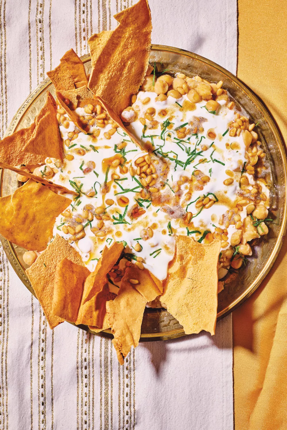 Fatteh brengt romige knoflookyoghurt, zachte kikkererwten en krokant Libanees brood samen tot een smaakvolle Middenoosterse mezze of troostrijk avondmaal. Het recept gebruikt aquafaba om de yoghurt zijdezacht te maken en vraagt om licht verwarmen van de erwten en het aanbakken van pijnboompitten in ghee. Heerlijk bij een gezellig diner of als deel van een etentje met vrienden.
