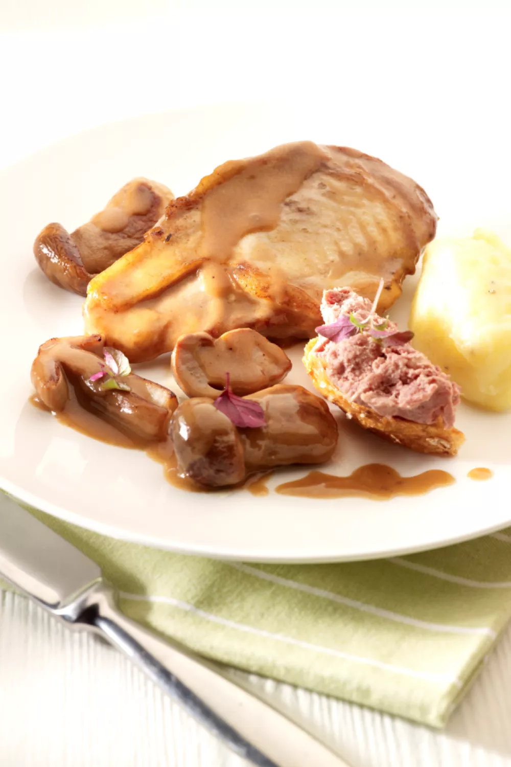 Leg een quenelle van puree op een bord en leg er een fazantenfilet naast. Lepel paddenstoelen en saus over het vlees. Serveer met een toastje met fazantenpaté.