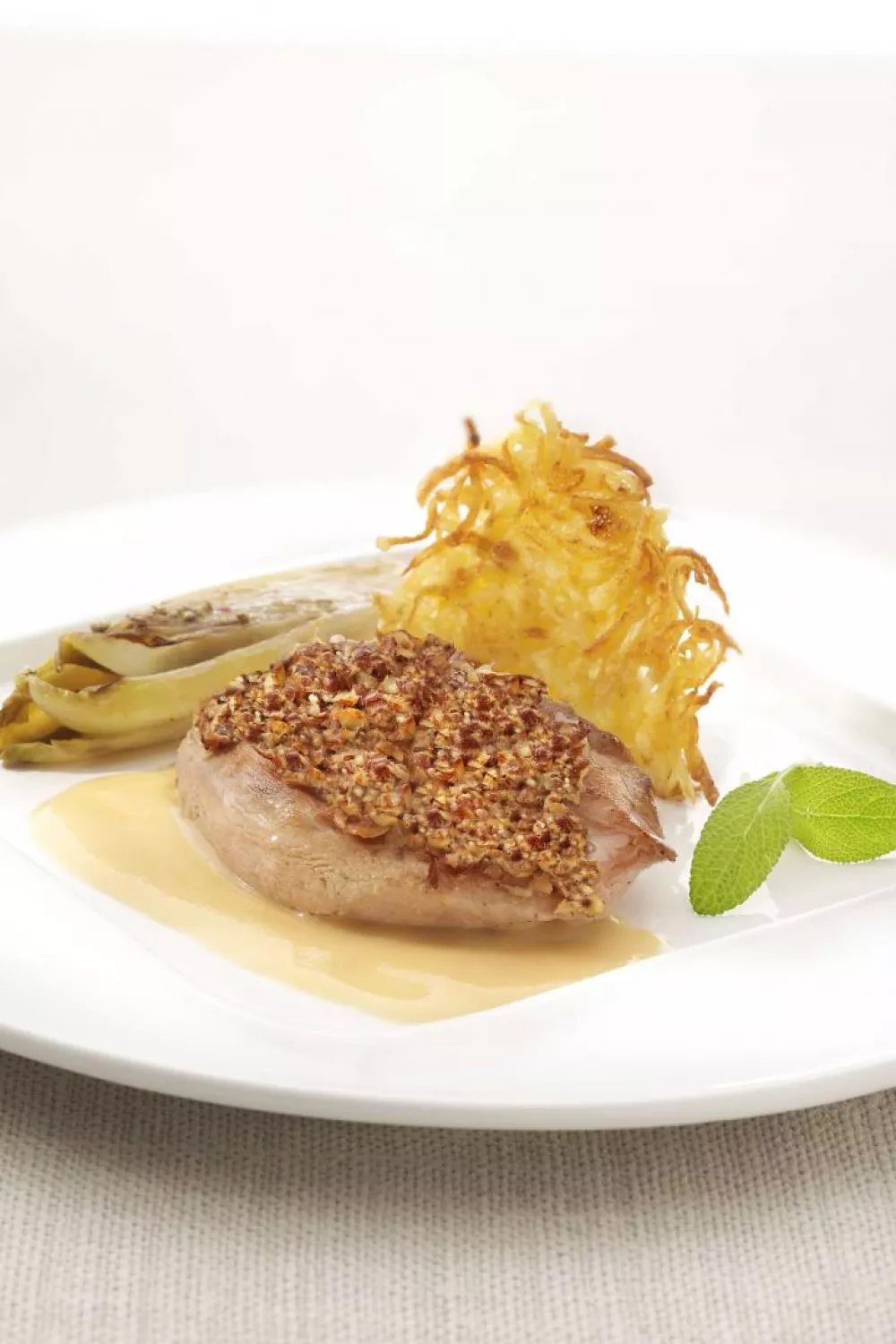 Gebakken fazantenfilet met een krokant korstje van fijngehakte hazelnoten en een gereduceerde calvadosroomsaus brengt herfstige wildsmaak en zachte romigheid samen. Erbij huisgemaakte knolselderkoekjes van geraspte aardappel en knolselderij en zacht gestoofd witloof voor klassieke Belgische en Franse accenten. Ideaal voor een feestelijk of winterig diner waarbij sauteren, afbakken in de oven en saus inkoken centraal staan.