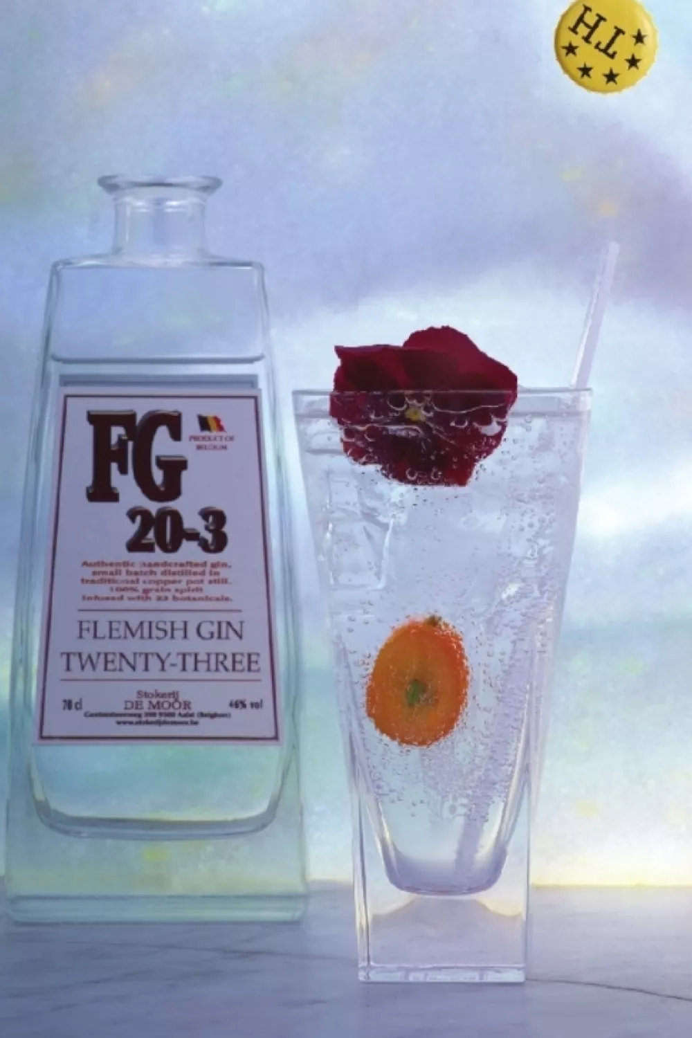 FG staat voor Flemish Gin, 20-3 verwijst naar de 23 botanicals. Daaronder niet alleen de klassiekers jeneverbes, engelwortel, koriander en citroen- en sinaasappelschil, maar ook zelden gebruikte ingrediënten zoals gemberwortel, johannesbrood, gezegende distel en paradijszaad. De gin wordt gestookt in kleine, authentieke koperen ketels. Volgens Stokerij De Moor uit Aalst is gin overigens een Vlaamse uitvinding: Jacob Van Maerlant schreef in de dertiende eeuw al over de heilzame kracht van de jeneverbes en de ervaren Vlaamse stokers leerden de Britten het vak in de zestiende eeuw.