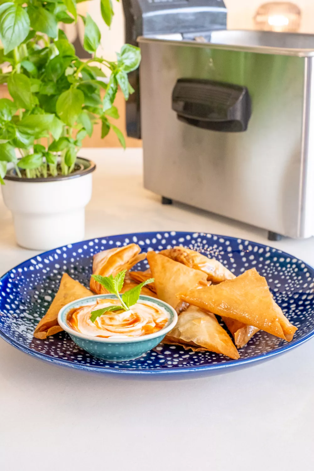 Knapperige filodriehoekjes gevuld met pittig kippengehakt en een zachte currykruidmix, geserveerd met een frisse Griekse yoghurtchilisaus. De combinatie van munt en koriander geeft een levendige toets aan de warme vulling terwijl het dunne filodeeg goudbruin en luchtig wordt gefrituurd. Perfect als borrelhapje of zomerse snack waar smaak en textuur samenkomen.