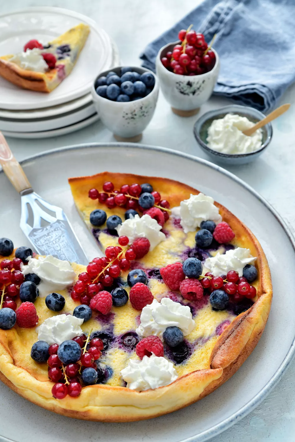 Deze Finse ovenpannenkoek pannukakku zet je in één keer in de oven voor een luchtige, goudbruine pannenkoek boordevol zomers rood fruit. Met gesmolten boter in de ovenschaal en een simpel beslag van eieren, bloem en melk krijg je een fluweelachtige textuur die je afwerkt met opgeklopte slagroom, frambozen en blauwe bessen. Perfect als feestelijk brunchgerecht, zomers dessert of gezellig tussendoortje.