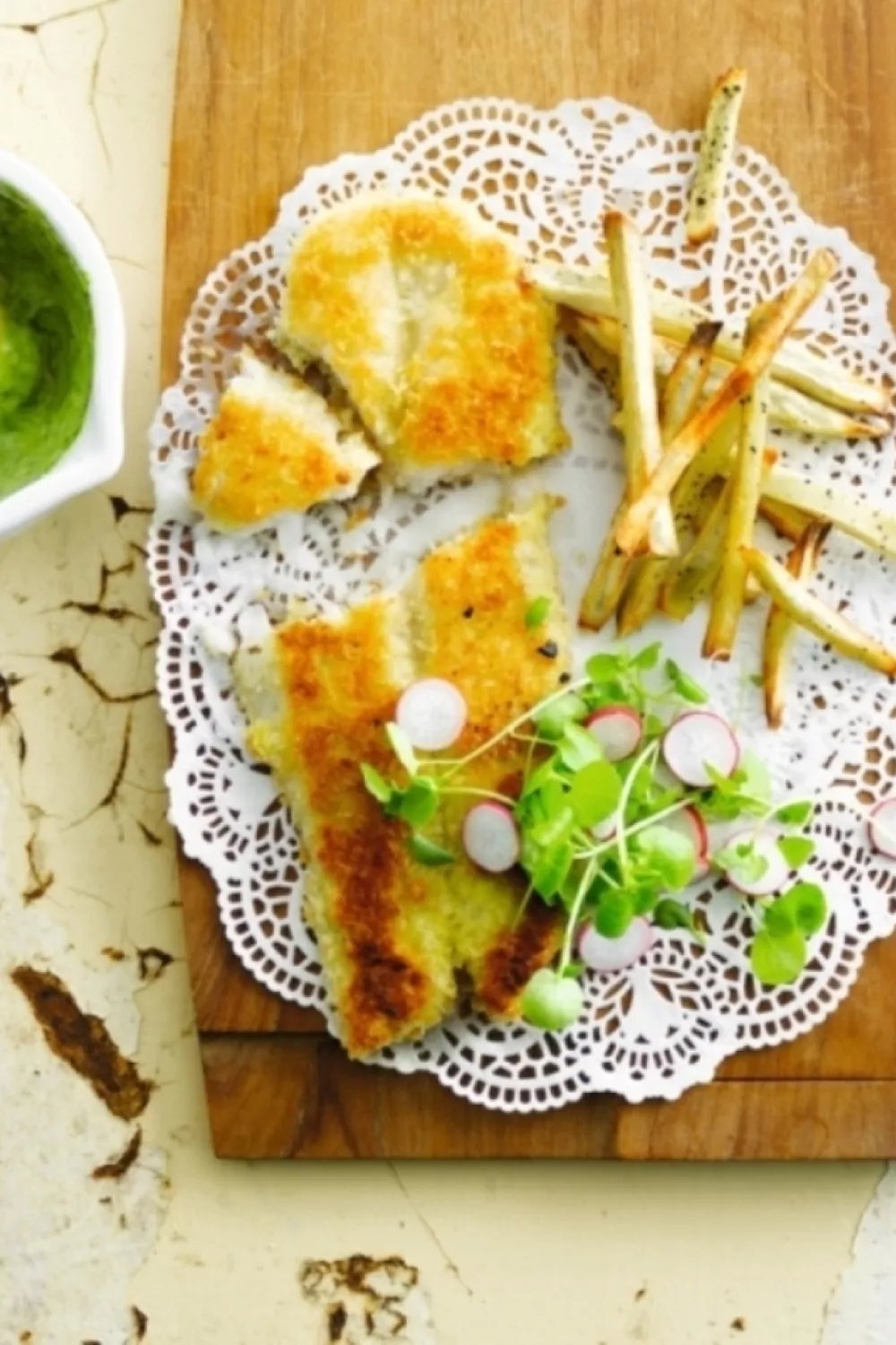 Serveer de gepaneerde vis samen met de aardappelfrietjes, de basilicummayonaise en een salade van waterkers en radijs.